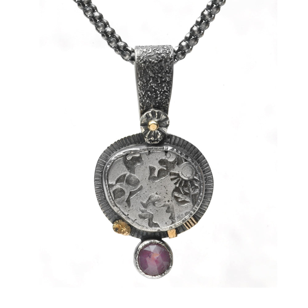 sterling silver, 18K gold, silver punch mark coin, ruby