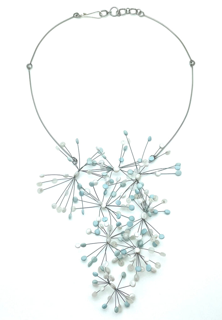 polymer clay, multi-strand nylon coated stainless steel wire, sterling silver and argentium silver catch and links